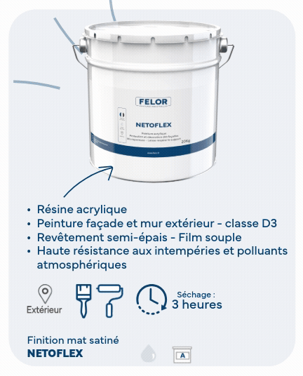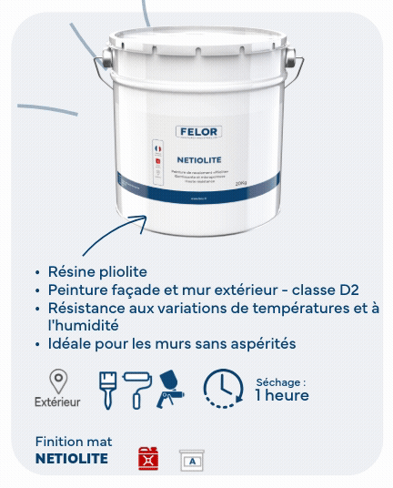 Pour obtenir un rendu optimal ou si votre façade est abîmée, nous vous conseillons d’appliquer une sous-couche qui rendra la surface homogène et facilitera l’adhérence des couches supérieures. Mélangez votre peinture. Commencez l’application de la peinture en démarrant par les bords et les angles, les parties difficilement accessibles à l’aide d’un pinceau. A l’aide d’un rouleau spécial façade, appliquez votre peinture par surface de 1m sur 1m en croisant les passes (vertical puis horizontal) et commencez par le haut. Laissez sécher 8 heures et appliquez la seconde couche.