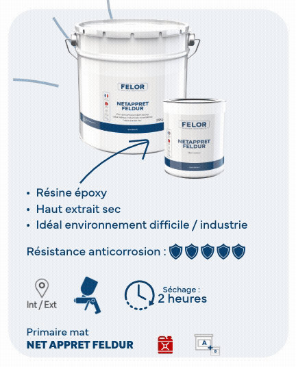 Le primaire époxy pour métal sert d’apprêt pour les surfaces métalliques problématiques en terme d’adhérence ou sur des supports exposés à des environnements très difficiles. Ce revêtement est une barrière protectrice contre les chocs ou l’abrasion en intérieur comme en extérieur. Le primaire époxy est un bi-composant qui peut s’appliquer sur le métal, le bois, les tôles galvanisées et les surfaces lisses comme l’alu, le zinc, l’inox. Le primaire époxy peut être recouvert par tout type de peinture de finition.
