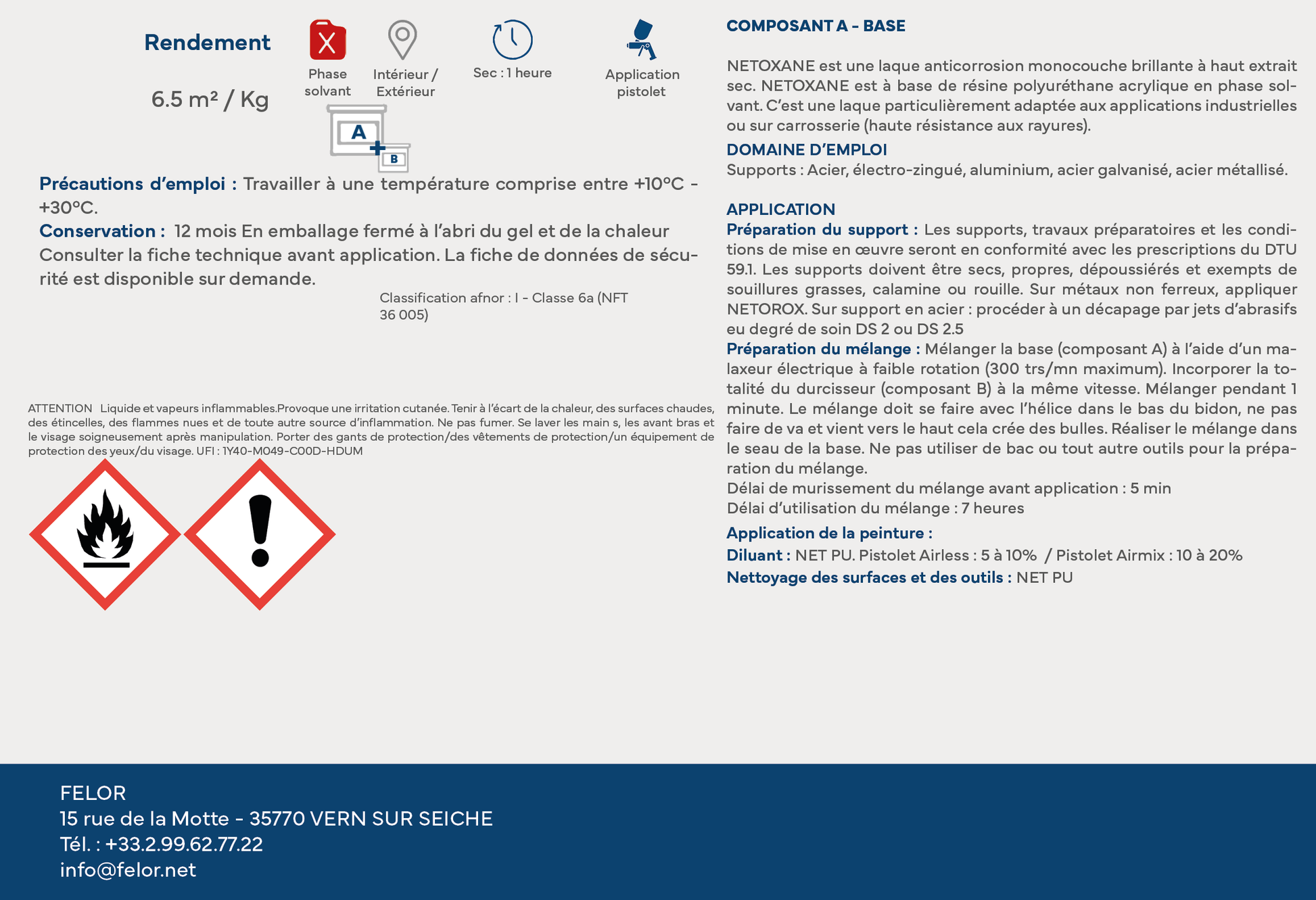 NETOXANE HB HC est une laque anticorrosion monocouche brillante. NETOXANE HB HC est à base de résine polyuréthane acrylique en phase solvant. C'est une laque particulièrement adaptée aux applications industrielles ou sur carrosserie (haute résistance aux rayures).