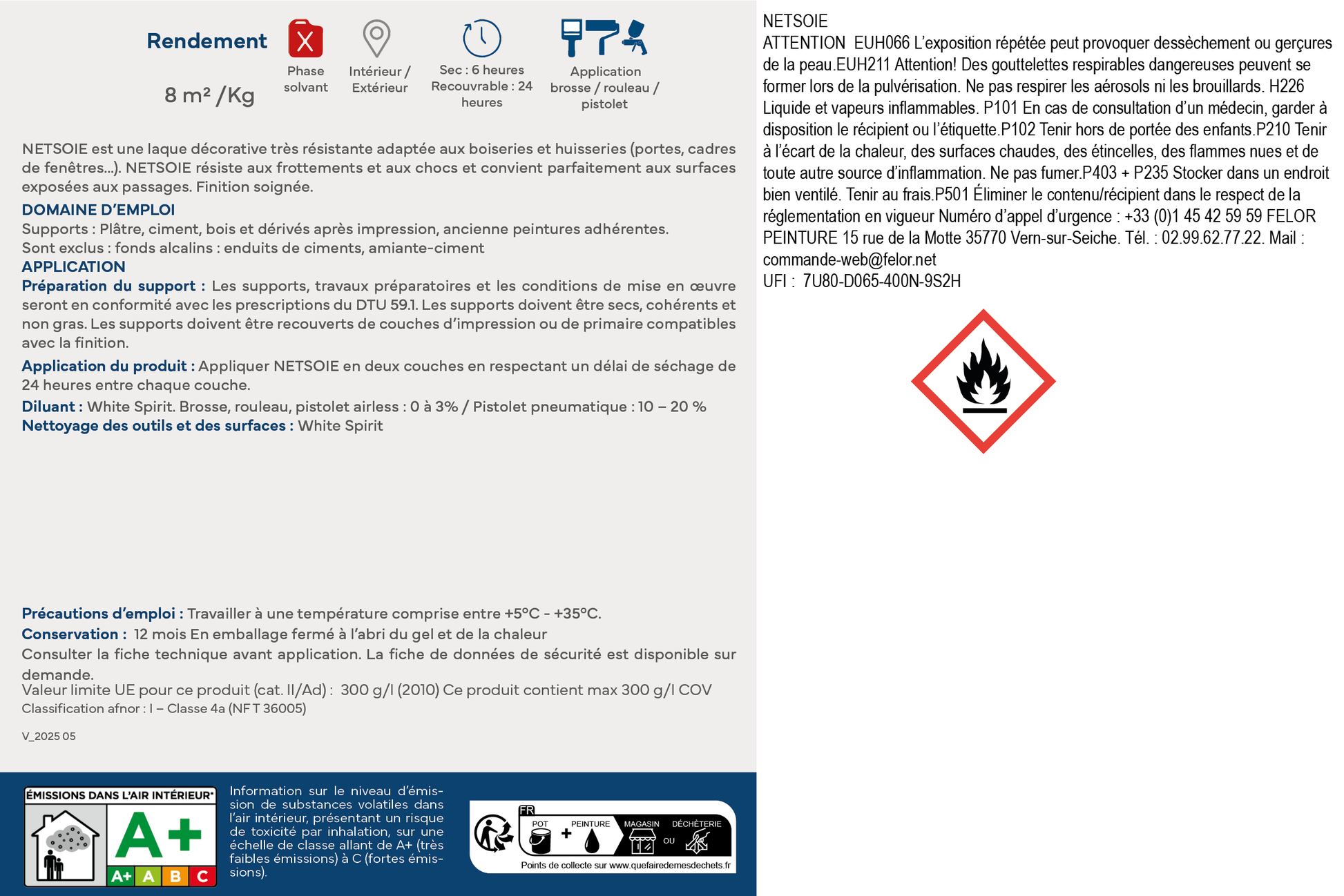 NETSOIE est une laque décorative très résistante adaptée aux boiseries et huisseries (portes, cadres de fenêtres...). NETSOIE résiste aux frottements et aux chocs et convient parfaitement aux surfaces exposées au passage. Finition soignée.