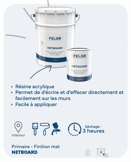 NETBOARD est idéal pour créer ou rénover des tableaux blancs pour feutre effaçable sur de multiples supports. Imaginez des tableaux de toutes les couleurs, grâce à sa version incolore.