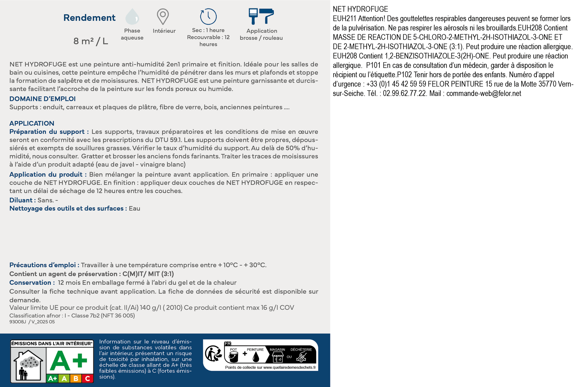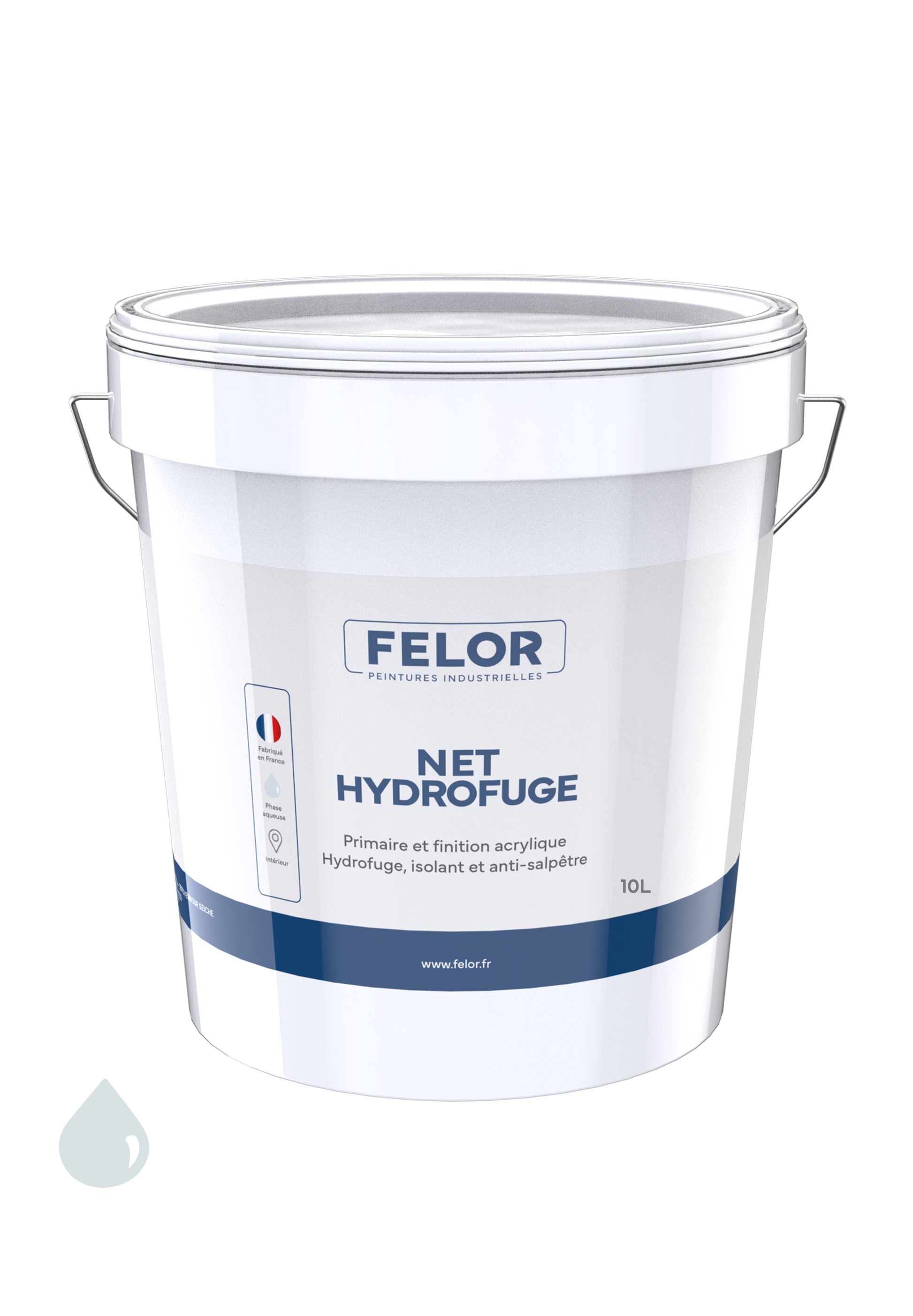 NET HYDROFUGE est une peinture anti-humidité 2en1 primaire et finition. Idéale pour les salles de bain, cuisines, cave. Cette peinture empêche l'humidité de pénétrer dans les murs et plafonds et stoppe la formation de salpêtre et de moisissure. NET HYDROFUGE est une peinture garnissante et durcissante facilitant l'accroche de la peinture sur les fonds poreux ou humides.