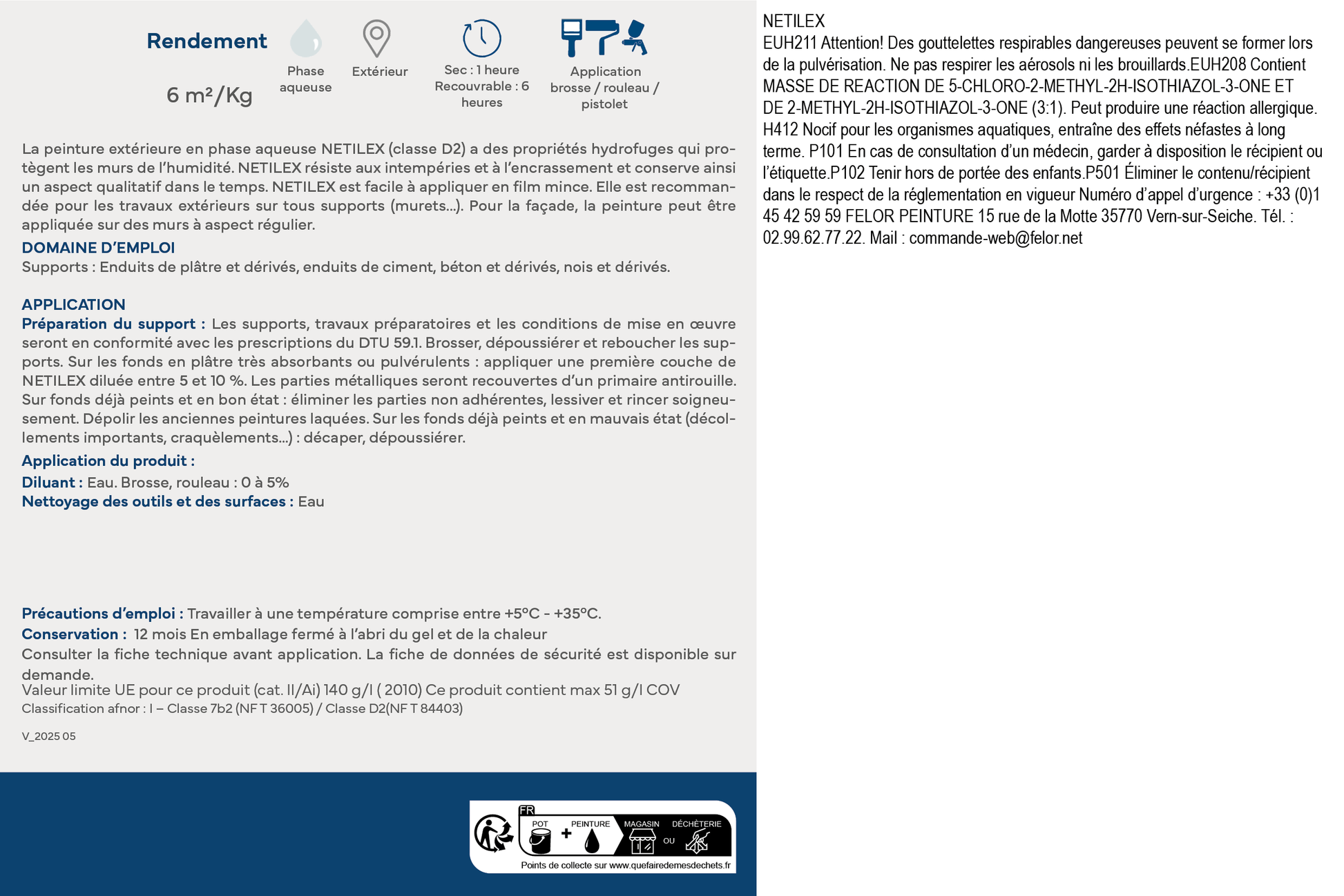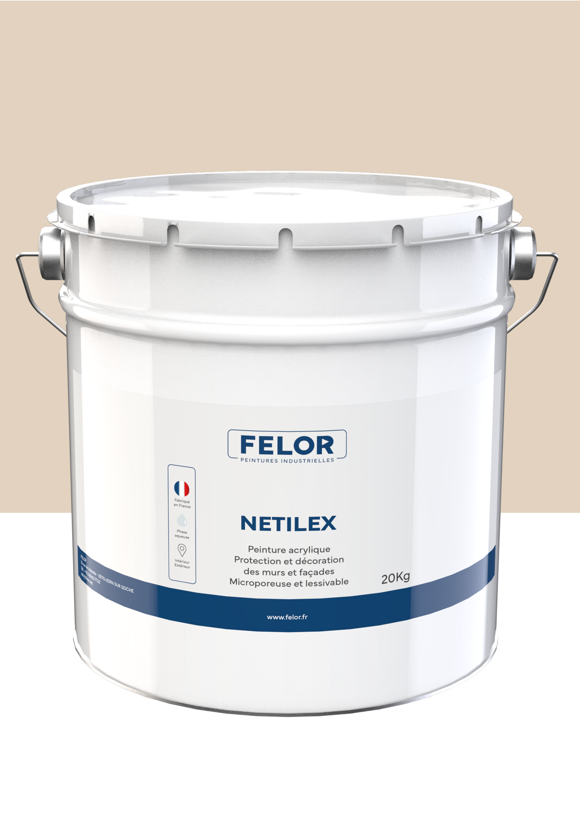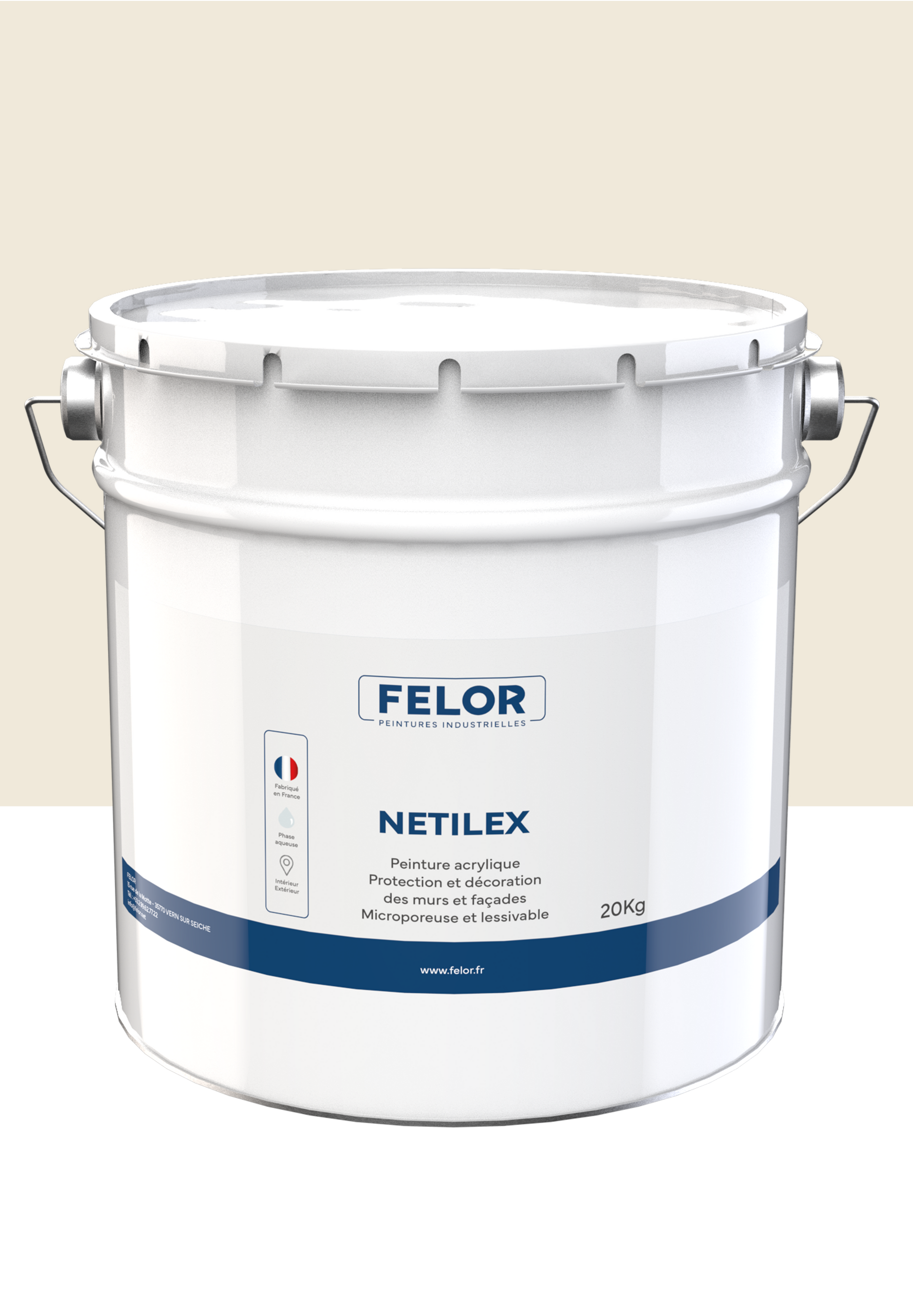 La peinture extérieure en phase aqueuse NETILEX (classe D2) a des propriétés hydrofuges qui protègent les murs de l'humidité. NETILEX résiste aux intempéries et à l'encrassement et conserve ainsi un aspect qualitatif dans le temps. NETILEX est facile à appliquer en film mince. Elle est recommandée pour les travaux extérieurs sur tous supports (murets...). Pour la façade, la peinture peut être appliquée sur des murs à aspect régulier.